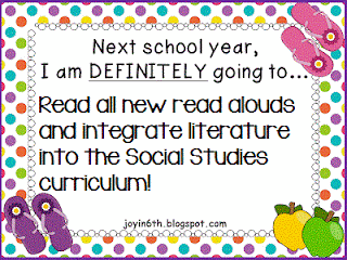I am looking for new read-aloud's and have some great ones on my list! With looping up, I had to get read aloud's that will be new next year. I have found some great ones, but am always looking for more! I also hope to read literature related to Social Studies, such as Number the Stars!Next year, I am changing the way I keep student data. This year I had a student binder with a tab for each student. It just didn't work for me. Next year I am using manila folders for each student. These folders will house beginning of the year data, parent communication log, SIP and BIP data, and tardy slips. My plan is to tape/glue a library pocket in each folder for tardy slips. I think this will work better for me!