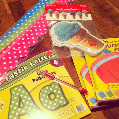 This didn't come from Big Lots, but I wanted to share them anyway. I got these goodies at the teacher store while I was home in Tennessee visiting family. More polka dot borders, ice cream cone cut-outs (they were 60% off), CUTE letters, pink pen, and pencil cut-outs (also 60% off).