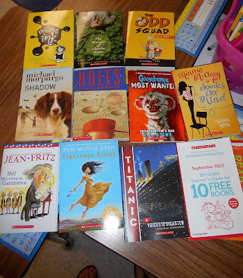 I wondered why the box was so heavy because I knew I hadn't ordered any books that would've been really heavy. Well, it was heavy because I got 10 free books! Then I remembered seeing something about that when I purchased the books. I recently got an email that I was now a "Red Apple Teacher" with Scholastic so I am assuming that's why! YAY!