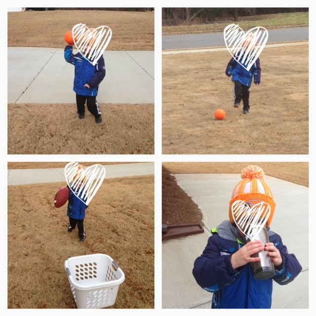 We had Mommy PE class this week! I actually got this idea from my previous teaching partner. She used to have "Sabrina's PE class" with her girls when they were younger. E was so funny when I was telling him we were going to do something new called "Mommy's PE class". We bundled up, went outside, and played games. First, we threw the ball back and forth. Then, we kicked the ball back and forth. While doing this, I asked Easton what sport we were playing (thinking he would say "kickball") and he said, "I think it's P-O-E" meaning PE! Too cute! We also tried throwing balls into a laundry basket (hey - whatever works, right?) and of course, we stopped for water breaks! We also walked a mile! He was exhausted by the end of it.