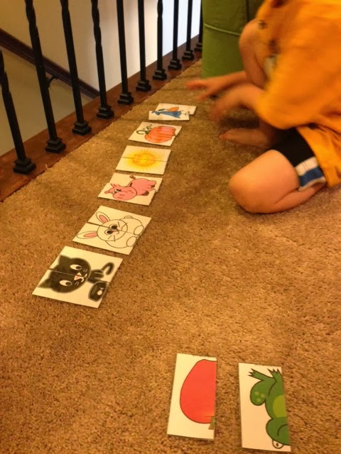 E knows all of his colors, but it doesn't hurt to continue working with them. Yesterday, I gave him a stack of these color puzzles (resource: Confessions of a Homeschooler) and let him match them up. He did a great job and loved them!