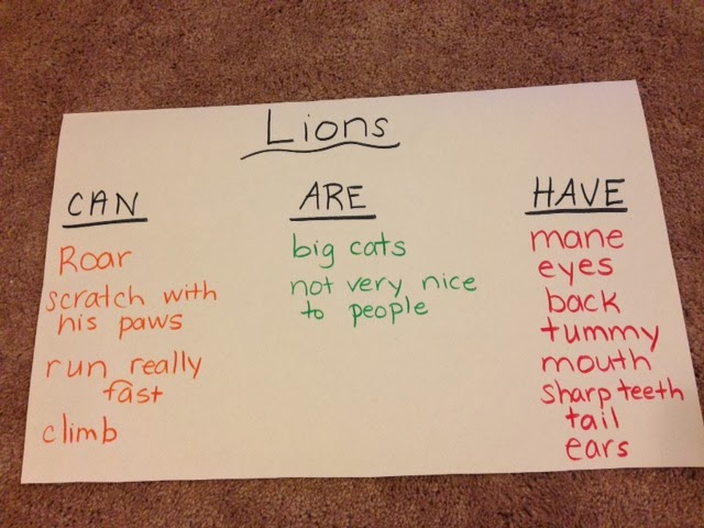 This week we are working on the letter L and are learning about lions! First, I had E tell me everything he could about lions. This chart reflects what he told me, word for word.