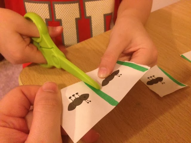 Another skill we will continue working on is cutting with scissors. I had photos of ants and I drew lines between them and had E cut along the lines.