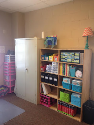 My next goal was to work in my teacher corner. First, I took the remaining student cubby and turned it so that it was taller vs. being longer. This way I can utilize the shelves better.