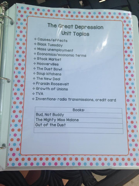 Inside each binder, I have a list of topics by unit that I need to cover within that unit. This helps me make sure I cover everything needed during the unit.