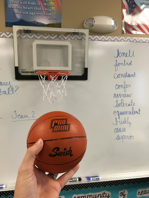 A few weeks ago I had the idea to incorporate sports into a vocabulary review. Many of my students play basketball on a team and/or play at recess, so I incorporated basketball into our review. My son received this over the door basketball set for Christmas so we brought it to school one day. He told me to "make sure they don't break it, but you CAN show them how to dunk it." Although I didn't share my dunking skills, my fifth graders LOVED this!