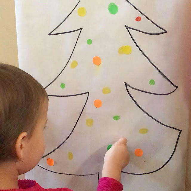 I used craft paper from our easel and taped it to the wall. I drew a Christmas tree and made yellow, orange, and green dots (those were the only color dot stickers I had at the time).