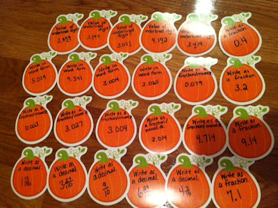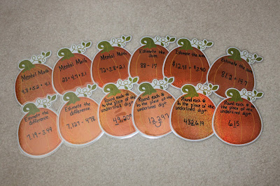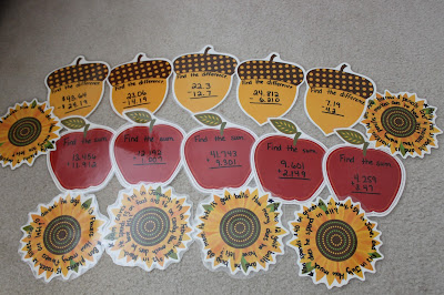 I bought these pumpkin/fall cutouts at Dollar Tree for $1.00 a few weeks ago and planned to write Math problems on them. Two weeks ago I showed you my Pumpkin Place Value for Monday Made It (Click here if you missed it). This week I did the same thing, except I didn't use place value. This time problems were: estimating sums and differences, rounding, adding and subtracting decimals, and multi-step story problems. The answers are on the back so students can self check their answers.